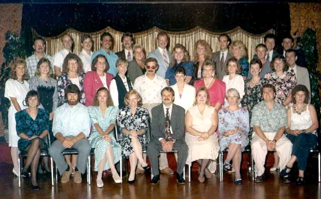 | The 15th Reunion was held at Runco's Lounge, Dunmore, PA. We had an open bar from 6:30 to 7:30 followed by a buffet dinner until 8:30. There was a short program of recollections from some of the classmates and prizes were given out to the classmate with the most kids, the classmate who traveled the furthest, etc. For the last three hours, many of our classmates danced to the hits of the 70's provided by a live band or reminisced around the open bar. For those who were unable to attend the reunion... "We had a blast !!!" The group photograph shown below was taken and is (was) available for $11. |